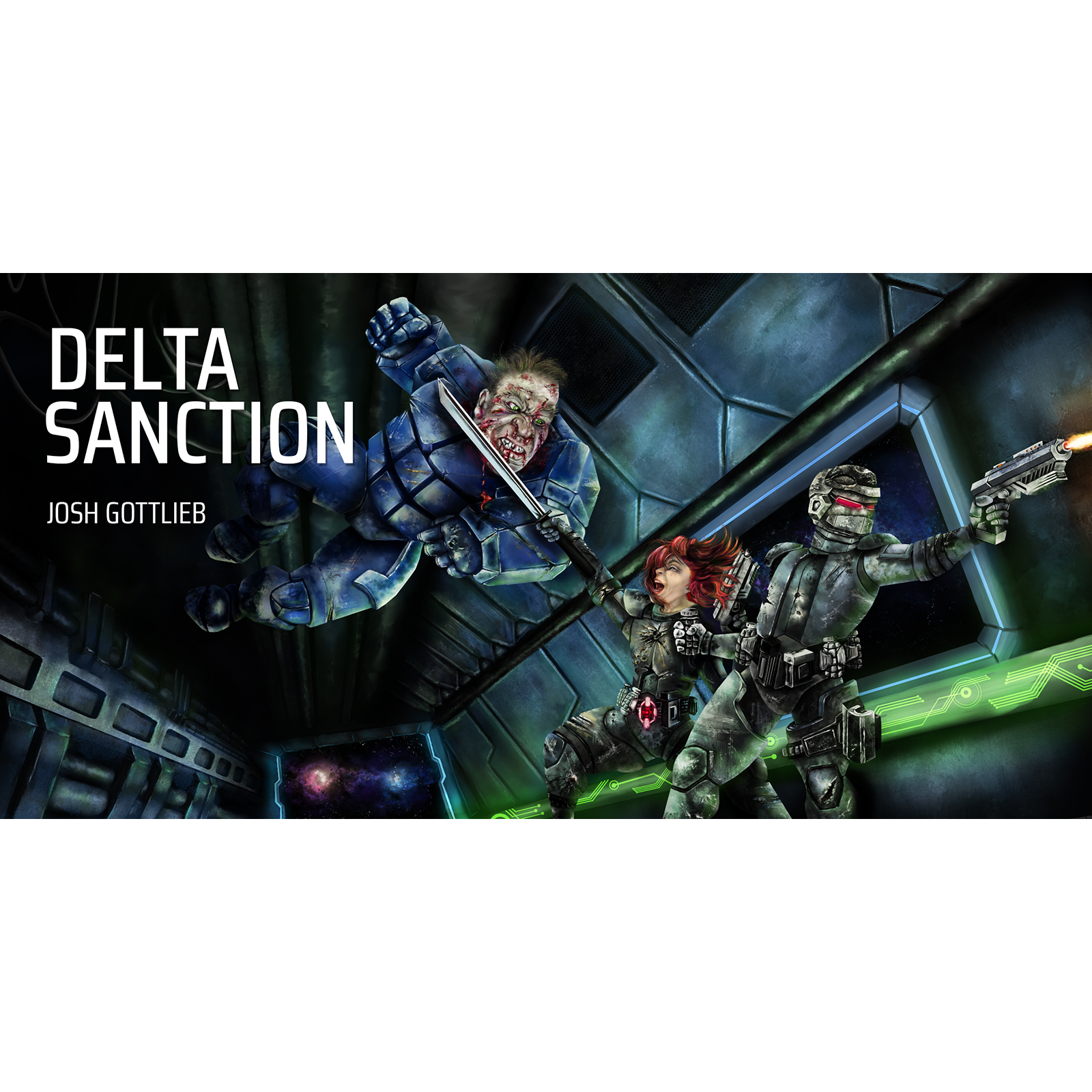 Paint a digital Sci-Fi book cover that illustrates a horribly injured juggernaut character in midair about to piledrive his fist into two soldiers, one female and one male, with extremely damaged armor. The female soldier quickly turns to defend herself with her sword while the male soldier to the left of her uses his gun to fight off the enemy off-screen. The particular scene takes place in space on an industrial-looking spaceship with green glowing circuitry on the walls.